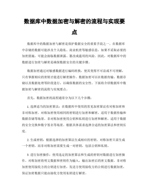一、数据库中数据加密与解密的流程在数据库中,数据加密和解密的流程大致可以分为以下几个步骤:1. 确定加密需求:首先要明确要加密的数据对象,是整个数据库还是特定的表、列或字段。