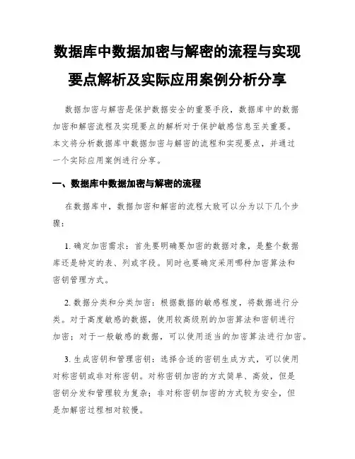 二、数据库中数据加密与解密的实现要点1. 数据分类和属性选择:根据数据的敏感程度,将数据进行分类。