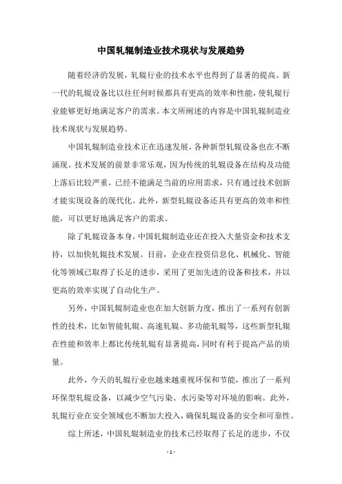 2. 轧辊的发展现状随着工业化进程的加快和技术的不断创新,轧辊行业取得了较快的发展。