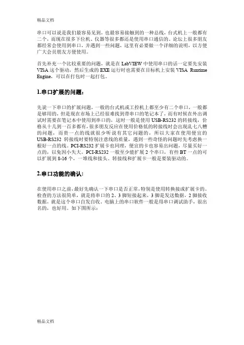 2.串⼝功能的确认:在使⽤串⼝之前,最好先确认⼀下串⼝是否正常,特别是使⽤转换接或扩展卡的。