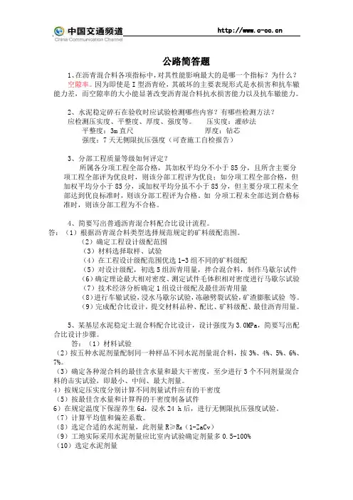 公路简答题1、在沥青混合料各项指标中,对其性能影响最大的是哪一个指标?为什么?空隙率。