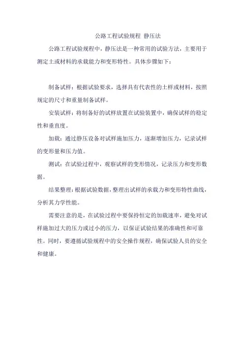 公路工程试验规程中,静压法是一种常用的试验方法,主要用于测定土或材料的承载能力和变形特性。