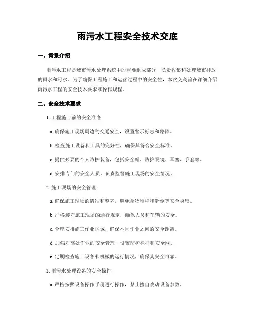 雨污水工程安全技术交底一、背景介绍雨污水工程是指城市排水系统中的雨水和污水的采集、输送和处理工程。