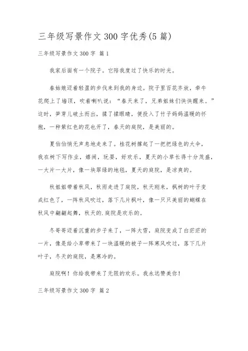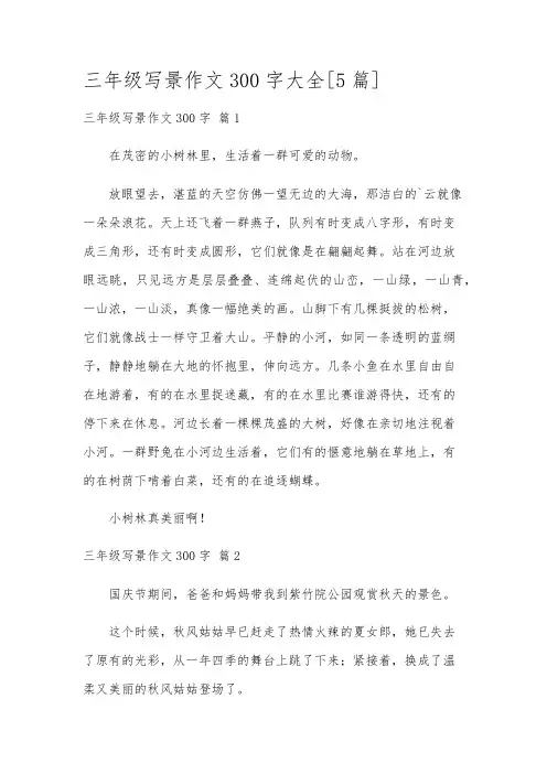 三年级写景作文300字(经典5篇)三年级写景作文300字篇1风景优美的地方有很多,如:响水湖公园,有海洋公园,有西湖公园……其中我最喜欢的地方是校园。