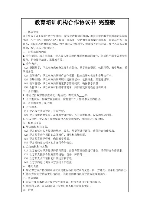 培训机构合作协议书范文8篇第1篇示例:培训机构合作协议书甲方:(培训机构名称)地址:(地址)法定代表人:(法定代表人姓名)联系方式:(联系方式)经甲、乙双方友好协商,本着互利共赢的原则,就合作事宜达成如下协议:一、合作内容1. 甲方为乙方提供(培训内容),乙方为甲方提供(合作内容)。