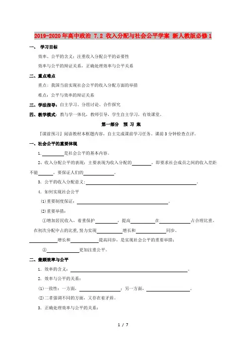 2019-2020年高中政治 7.2 收入分配与社会公平学案新人教版必修1 一、学习目标效率、公平的含义;注重收入分配公平的必要性效率与公平的辩证关系,正确处理效率与公平关系二、重点难点重点: 我国当前实现社会公平的收入分配方面的举措难点:公平与效率的辩证关系三、学法指导:自主学习、分组讨论、合作探究四、教学模式:教与学一体化,教师引导,学生自主学习,有效课堂。