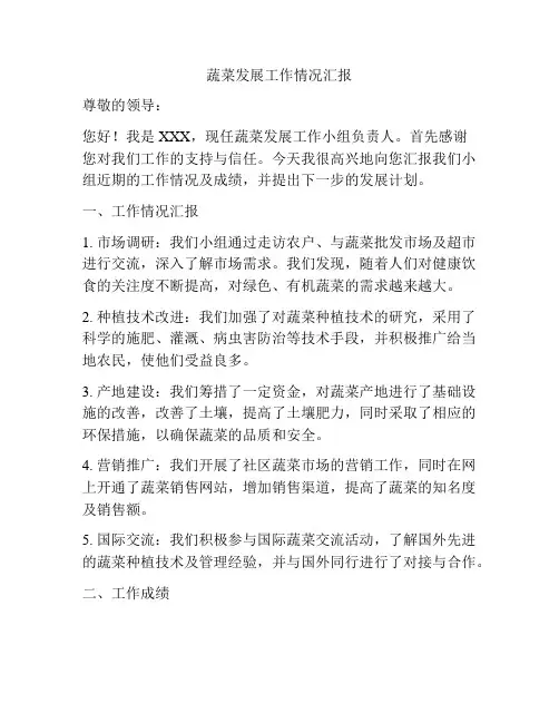 蔬菜发展工作情况汇报尊敬的领导:您好!我是XXX,现任蔬菜发展工作小组负责人。