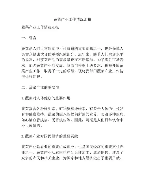 蔬菜产业工作情况汇报蔬菜产业工作情况汇报一、引言蔬菜是人们日常饮食中不可或缺的重要食物之一,也是保障人民群众健康饮食的重要组成部分。