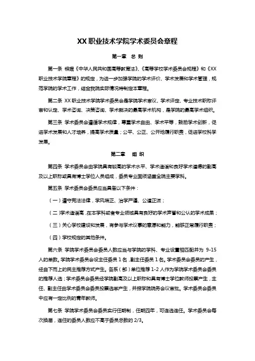 XX职业技术学院学术委员会章程第一章总则第一条根据《中华人民共和国高等教育法》、《高等学校学术委员会规程》和《XX 职业技术学院章程》的规定,为进一步加强学院的学术评价、学术发展和学术管理,规范学院的学术工作,结合我院实际情况特制定本章程。