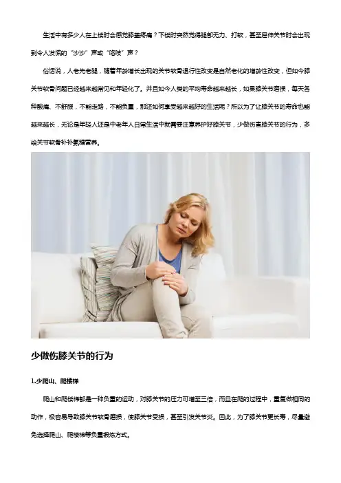 少做伤膝关节的行为1.少爬山、爬楼梯爬山和爬楼梯都是一种负重的运动,对膝关节的压力可增至三倍,而且在爬的过程中,重复做相同的动作,极容易导致膝关节软骨磨损,使膝关节受损,甚至引发关节炎。