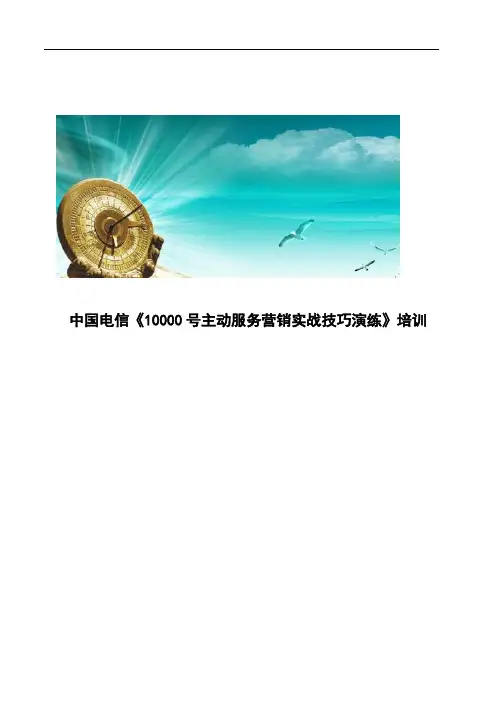 中国电信《10000号主动服务营销实战技巧演练》培训一、呼入、呼出服务销售工作过程中普遍存在以下挑战:✧顾客在没有准备的情况下接到陌生电话总是习惯性拒绝!✧面对一次又一次的被拒绝、挫败,工作中几乎找不到成就感!✧明明是给客户带来一个很好的服务,但客户却说我们是骗子!✧赢得信赖才有销售,但值得客户信赖的声音形象太难建立!✧产品呈现难,无形产品呈现更难!通过电话进行无形产品呈现是难上加难!✧顾客需求对销售很重要,但顾客却不会轻易告诉我们他的需求!✧顾客本来就很忙,很难有时间进行日常交流与关系维系!✧挽留政策很好,但顾客根本就不买账!✧顾客流失并不可怕,关键是如何找到顾客流失的原因!如果对这些问题没有清晰的答案,我们将为您提供系统的解决方案。