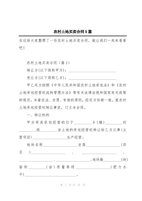农村土地买卖合同5篇在这给大家整理了一些农村土地买卖合同,就让我们一起来看看吧!农村土地买卖合同(篇1)转让方(以下简称甲方):_________________________受让方(以下简称乙方):_________________________甲乙双方按照《中华人民共和国农村土地承包法》和《农村土地承包经营权流转管理办法》等有关法律法规和国家有关政策的规定,本着依法、自愿、有偿的原则,经双方协商一致,就农村土地承包经营权转让事宜,订立本合同。