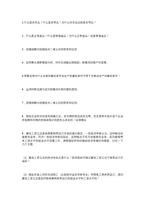 经济学题集一、选择题1.哪种情况最可能导致商品价格上涨?A. 供给增加,需求不变B. 供给减少,需求不变C. 供给不变,需求减少D. 供给和需求同时增加答案:B2.当一种商品的需求曲线向右移动时,表示:A. 需求量减少B. 需求量增加C. 供给量减少D. 供给量增加答案:B3.供给曲线向右移动可能是因为:A. 生产成本上升B. 预期未来价格下降C. 生产技术改进D. 替代品价格下降答案:C4.哪种因素的变化不会直接影响需求曲线的位置?A. 消费者收入B. 商品价格C. 消费者偏好D. 相关商品价格答案:B5.在完全竞争市场中,如果一种商品的需求增加且供给减少,那么:A. 均衡价格将下降B. 均衡数量将减少C. 均衡价格将上升,均衡数量可能增加D. 均衡价格将上升,均衡数量将减少答案:D6.当一种商品的价格弹性大于1时,该商品是:A. 缺乏弹性的B. 富有弹性的C. 单位弹性的D. 垂直弹性的答案:B7.下列哪项不是影响供给曲线移动的因素?A. 生产成本B. 生产者预期C. 消费者收入D. 自然资源可获得性答案:C8.哪种情况会导致需求曲线向左移动?A. 替代品价格下降B. 互补品价格下降C. 消费者收入增加D. 消费者偏好增强答案:A9.供给法则表明,在其他条件不变的情况下,商品价格上升时:A. 供给量减少B. 供给量增加C. 供给曲线向右移动D. 供给曲线向左移动答案:B10.当一种商品的供给量大于需求量时,市场价格会:A. 上升B. 下降C. 保持不变D. 无法确定答案:B11.如果一种商品的需求增加且供给减少,那么该商品的均衡价格将:A. 下降B. 上升C. 保持不变D. 可能上升也可能下降答案:B12.下列哪项不属于影响需求的因素?A. 消费者收入B. 商品价格C. 生产者预期D. 消费者偏好答案:C13.需求法则表明,在其他条件不变的情况下,商品价格下降时:A. 需求量减少B. 需求量增加C. 需求曲线向右移动D. 需求曲线向左移动答案:B14.哪种情况会导致供给曲线向左移动?A. 生产成本下降B. 生产者预期未来价格上升C. 自然资源减少D. 替代品价格下降答案:C15.当一种商品的交叉价格弹性为正时,这两种商品是:A. 替代品B. 互补品C. 正常商品D. 劣质商品答案:A16.如果一种商品的需求价格弹性为0,那么这种商品是:A. 富有弹性的B. 缺乏弹性的C. 单位弹性的D. 垂直弹性的答案:B17.哪种情况会导致需求曲线向右移动且供给曲线向左移动?A. 消费者收入增加,生产成本上升B. 替代品价格下降,互补品价格上升C. 消费者偏好增强,自然资源减少D. 消费者收入减少,生产者预期未来价格下降答案:C18.当供给曲线和需求曲线同时向右移动时,均衡价格和均衡数量的变化是:A. 均衡价格下降,均衡数量减少B. 均衡价格上升,均衡数量增加C. 均衡价格不变,均衡数量增加D. 无法确定答案:B19.下列哪项不是影响供给的因素?A. 生产成本B. 生产者预期C. 消费者收入D. 生产技术水平答案:C20.如果一种商品的需求曲线是垂直的,那么这种商品是:A. 富有弹性的B. 缺乏弹性的C. 单位弹性的D. 完美竞争的答案:B21.下列哪种市场结构中,产品是完全无差别的?A. 完全竞争市场B. 垄断竞争市场C. 寡头垄断市场D. 完全垄断市场答案:A22.哪种市场结构中的企业数量最多?A. 垄断竞争市场B. 寡头垄断市场C. 完全垄断市场D. 完全竞争市场答案:D23.寡头垄断市场的特征之一是?A. 市场上只有一个生产者B. 市场上存在大量同质产品C. 进入市场容易D. 少数几家企业控制市场答案:D24.完全垄断市场的厂商面临的需求曲线是?A. 水平的B. 垂直的C. 向右下方倾斜的D. 向右上方倾斜的答案:C25.哪种市场结构中,企业可以自由进入和退出市场?A. 寡头垄断市场B. 完全垄断市场C. 垄断竞争市场D. 完全竞争市场答案:D26.垄断竞争市场的产品特点是?A. 完全无差别B. 高度标准化C. 略有差别D. 完全不同答案:C27.在哪种市场结构中,价格由市场供求关系决定?A. 垄断竞争市场B. 寡头垄断市场C. 完全竞争市场D. 完全垄断市场答案:C28.寡头垄断市场中,企业之间的行为常表现为?A. 完全独立B. 相互依赖C. 互不干涉D. 竞争激烈答案:B29.完全竞争市场中,企业面临的需求曲线是?A. 与整个市场需求曲线重合B. 垂直的C. 水平的D. 倾斜的答案:C30.哪种市场结构下,企业数量少且产品差异小?A. 寡头垄断市场B. 垄断竞争市场C. 完全竞争市场D. 完全垄断市场答案:A31.垄断竞争市场的厂商短期均衡条件是?A. P=MCB. P=ACC. MR=MCD. P=MR答案:C32.完全垄断市场中,厂商的需求曲线与什么曲线重合?A. 平均收益曲线B. 边际收益曲线C. 供给曲线D. 总收益曲线答案:A33.下列哪种市场结构中的企业,其产量决策对其他企业影响最大?A. 完全竞争市场B. 垄断竞争市场C. 寡头垄断市场D. 完全垄断市场答案:C34.垄断竞争市场与完全竞争市场的主要区别在于?A. 厂商数量B. 产品差异C. 进入难度D. 价格控制答案:B35.寡头垄断市场中,厂商之间通常存在?A. 激烈的价格竞争B. 默契的价格协议C. 完全的价格统一D. 无序的价格混乱答案:B36.完全竞争市场中,厂商的长期均衡条件是?A. P=MCB. MR=MCC. P=ACD. MR=AC答案:D37.哪种市场结构下,企业最容易实现规模经济?A. 垄断竞争市场B. 寡头垄断市场C. 完全竞争市场D. 完全垄断市场答案:D38.垄断竞争市场中,企业的广告行为主要是为了?A. 提高产品质量B. 降低生产成本C. 扩大市场份额D. 增加产品差异答案:D39.寡头垄断市场中,价格变动的可能性主要取决于?A. 市场需求变化B. 企业成本变化C. 企业之间的合作与竞争D. 政府政策调控答案:C40.在哪种市场结构中,企业的