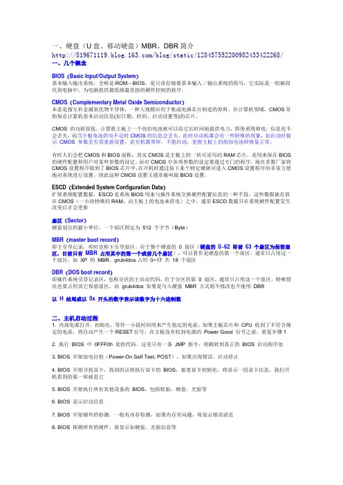 第2、3、4字节本分区的起始磁头号、扇区号、柱面号第5字节分区类型符:00H——表示该分区未用06H——FAT16基本分区0BH——FAT32基本分区05H——扩展分区07H——NTFS分区0FH——(LBA模式)扩展分区83H—— Linux分区第6、7、8字节本分区的结束磁头号、扇区号、柱面号第9、10、11、12字节本分区之前已用了的扇区数第13、14、15、16字节本分区的总扇区数1、什么是逻辑驱动?2、什么是物理驱动器?3、怎么搜索MBR、EBR、DBR?MBR、EBR、DBR他们都是以55AA结尾在winhex中搜索16进制:55AA 偏移512=510(1)搜索DBR的标志:FAT16的DBR:EB 3C 90 没有备份的DBRFAT32的DBR:EB 58 90 (备份的DBR)在该分区的第6扇区NTFS的DBR: EB 52 90 (备份的DBR)在该分区的最后一个扇区判别MBR的方法:MBR就在LBA第一个扇区,打开物理硬盘,第一个扇区就是了。