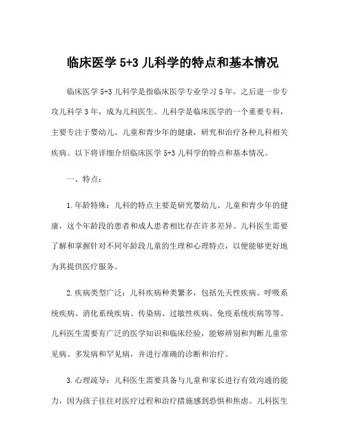 三、临床医学5+3儿科学的特点临床医学5+3儿科学作为一门兼容性较强的医学科学,具有多方面的特点:1. 多学科交叉应用:儿科学的特殊性需要在医学、心理学、社会学等多个学科领域进行交叉研究和应用。
