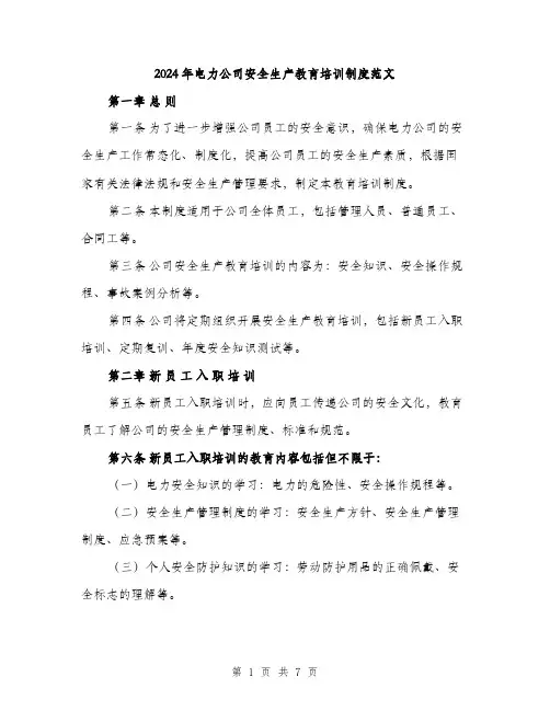 2024年电力公司安全生产教育培训制度范文第一章总则第一条为了进一步增强公司员工的安全意识,确保电力公司的安全生产工作常态化、制度化,提高公司员工的安全生产素质,根据国家有关法律法规和安全生产管理要求,制定本教育培训制度。
