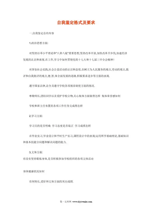 自我鉴定格式及要求一,自我鉴定总结内容1,政治思想方面:对坚持以邓小平理论和"八荣八耻"重要思想,坚持改革开放,加快改革开步伐,加速经济发展的认识和表现.在工作,学习中如何贯彻党的十七大和十七届三中全会精神!对参加社会实践,社会公益活动的认识和态度,在树立为人民服务的观点,劳动的观点,批评和自我批评的观点,德,智,体全面发展的道路,积极要求进步等方面的表现.遵守国家法律,法令及遵守学校各项规章制度方面的情况.尊敬师长,团结同学以及爱护学校公物,关心集体方面做得怎样集体荣誉感如何学校和班主任布置的各项工作任务完成得怎样2,学习方面:学习目的是否明确学习态度是否端正学习成绩怎样在毕业实习,毕业设计和平时生产实习,课程设计中的表现;运用所学基础理论,基础知识和基本技能分问题和解决问题的能力.3,文体方面:有没有坚持锻炼身体,是否积极参加学校组织的各项文体活动身体健康状况如何有何特长,爱好和文体方面的突出成绩.二,自我鉴定写作要求:1,一律用钢笔或签字笔填写.2,总字数不少于400字.怎样写自我鉴定自我鉴定一般包括以下五个方面的内容:1.思想政治方面。