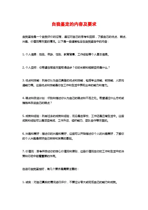 自我鉴定的内容及要求自我鉴定是一个自我评价的过程,通过对自己的思考和回顾,了解自己的优点、弱点、兴趣、价值观等方面的情况。