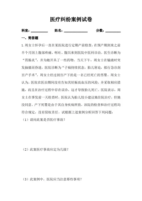 医疗纠纷案例试卷科室:__________ 姓名:______________ 分数:_________一、简答题1.周女士怀孕后一直在某医院进行定期产前检查,在预产期到来之前半个月因上腹部疼痛、呕吐、腹泻来到医院中医科诊治。