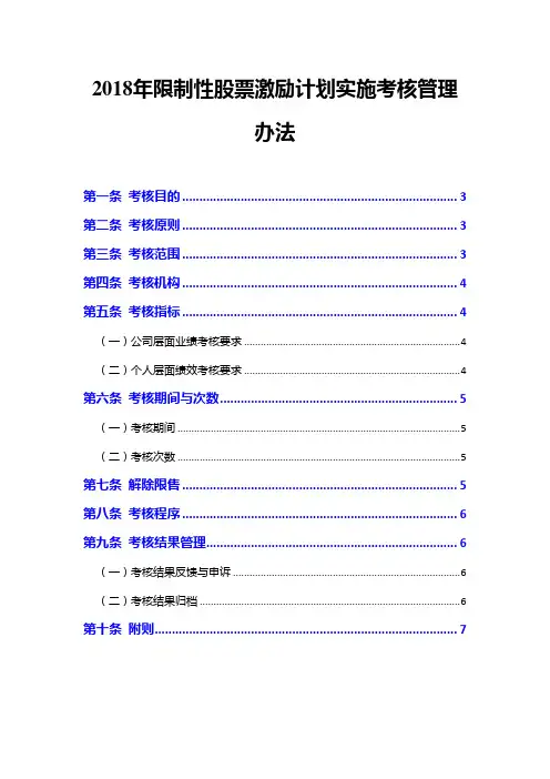 2018年限制性股票激励计划实施考核管理办法第一条考核目的 (2)第二条考核原则 (2)第三条考核范围航 (3)第四条考核机构及执行机构 (3)第五条绩效考核指标及标准 (3)(一)公司层面的业绩考核要求 (4)(二)激励对象个人层面的绩效考核要求 (4)第六条考核程序 (5)第七条考核期间与次数 (5)(一)考核期间 (5)(二)考核次数 (5)第八条考核结果管理 (5)(一)考核结果反馈及应用 (5)(二)考核记录归档 (6)第九条附则 (6)公司为进一步完善公司法人治理结构,建立、健全公司的长效激励约束机制,吸引和留住专业管理、核心技术和业务人才,充分调动其积极性和创造性,有效提升核心团队凝聚力和企业核心竞争力,有效地将股东、公司和核心团队三方利益结合在一起,使各方共同关注公司的长远发展,确保公司发展战略和经营目标的实现,在充分保障股东利益的前提下,公司制订了《2018年限制性股票激励计划》(以下简称“激励计划”、“股权激励计划”或“限制性股票激励计划”)。