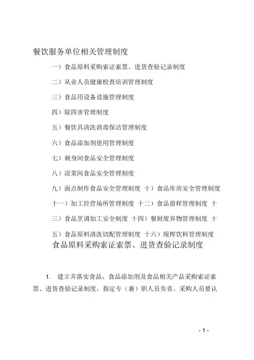 餐饮服务单位相关管理制度(一)食品原料采购索证索票、进货查验记录制度(二)从业人员健康检查培训管理制度(三)食品用设备设施管理制度(四)除四害管理制度(五)餐饮具清洗消毒保洁管理制度(六)食品添加剂使用管理制度(七)刺身间食品安全管理制度(八)凉菜间食品安全管理制度(九)面点制作食品安全管理制度(十)食品库房安全管理制度(十一)加工经营场所管理制度(十二)食品留样管理制度(十三)食品烹调加工安全制度(十四)餐厨废弃物管理制度(十五)食品原料清洗切配管理制度(十六)现榨饮料管理制度食品原料采购索证索票、进货查验记录制度1.建立并落实食品、食品添加剂及食品相关产品采购索证索票、进货查验记录制度,指定专(兼)职人员负责。