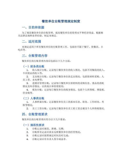 二、制度目的1. 规范餐饮单位台账管理,确保食品采购、加工、销售过程可追溯。