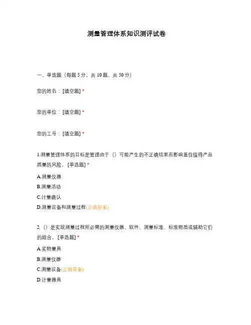 测量管理体系知识测评试卷一、单选题(每题5分,共10题,共50分)您的姓名: [填空题] *_________________________________您的单位: [填空题] *_________________________________您的工号: [填空题] *_________________________________1.测量管理体系的目标是管理由于()可能产生的不正确结果而影响盖住值得产品质量的风险。