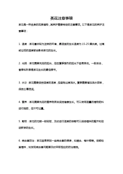 三、施肥管理1. 施肥时间:茶花的生长期通常在春季和秋季,这两个季节是施肥的最佳时机。