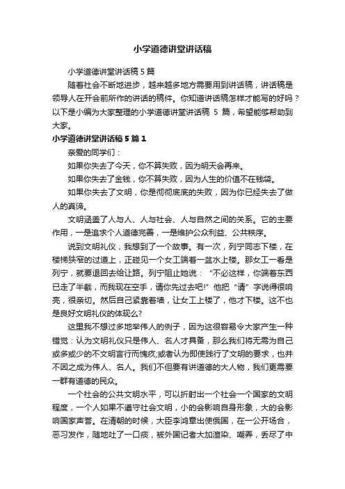 你知道讲话稿怎样才能写的好吗?以下是小编为大家整理的小学道德讲堂讲话稿5篇,希望能够帮助到大家。