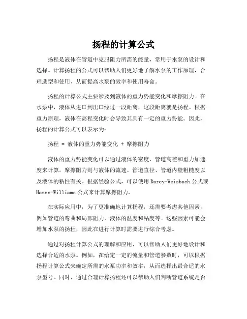 根据这个原理,我们可以得到以下扬程计算公式:H = (P2 - P1) / (ρ * g)其中,H表示扬程,P2和P1分别表示液体在两个不同位置上的压力,ρ表示液体密度,g表示重力加速度。