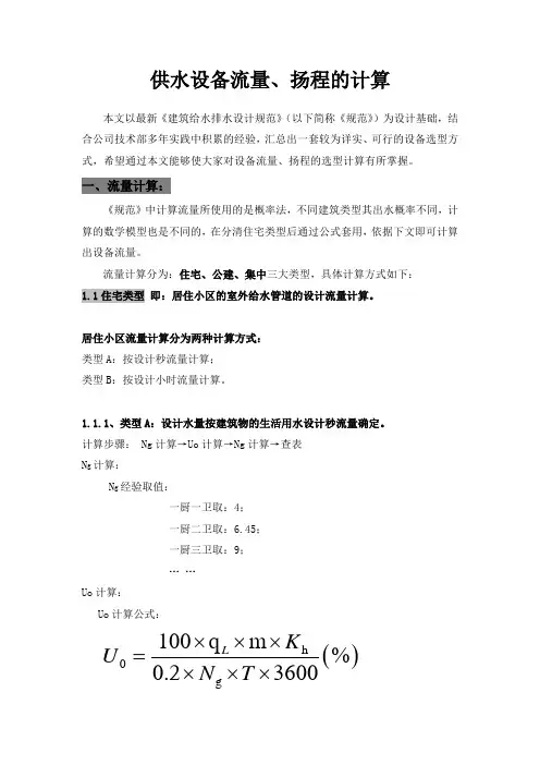 水泵流量的计算公式可以表示为:Q = A × v其中,Q表示水泵流量,A表示液体通过截面的面积,v表示液体的速度。