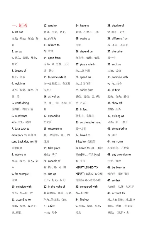 一. 短语1. set out出发;开始;陈述;陈列2. set upv. 建立;装配;开业;竖立3. dozens of几十;许多4. look into调查;观察;窥视;浏览;看5. worth doing值得做;物有所值6. in advanceadv. 预先,提前7. data back todata back to: 追溯到send back data to: 发回数据来8. involve in参与;涉及;卷入,陷入9. for example例如10. coincide with符合;与...相一致11. according to根据,按照;取决于;据…所说12. tend to趋向;注意;易于;有…的倾向13. related to与…有关14. apart from远离,除…之外;且不说;缺少15. to some extent在一定程度上;在某种程度上16. as well as也;和…一样;不但…而且17. expand to扩大到18. response to对……的回答;对……的反应19. take place发生;举行20. capable of有…能力的;可…的21. rise up上升;起义;叛变22. in the wake of紧紧跟随;随着…而来;作为…的结果;仿效23. a few一些;几个24. have to必须;不得不;只好25. ought to应该26. depend on取决于;依赖;依靠27. play a role in在……起作用28. spend on在…方面花费29. suffer from忍受,遭受;患…病;受…之苦30. in fact事实上,实际上31. on the other hand另一方面32. linked tolinked to: 关联的be linked to: 和……有联系的|和……有关联的|和…有关HEART LINKED TOHEART: 心连心|心心相连|联系到心脏的心脏33. compared with与...相比较34. find outv. 找出,查明;发现,揭发35. deprive ofvt. 剥夺;失去36. different from与…不同,不同于37. the other另一个38. such as比如;诸如39. combine withvt. 与...结合40. at first起先,首先;最初41. show off炫耀;卖弄42. as long as只要;和…一样长43. compared to与…相比44. no matter不论怎样;不要紧45. pay attention to注意;重视46. be likely to倾向于,很有可能47. so that为的是,以便;以至于48. account for对…负有责任;对…做出解释;说明……的原因;导致;(比例)占49. be similiar tobe similiar to: 跟...相似50. in check受控制的;受抑制的51. collide with冲突52. enough to足以,足够做53. be close to接近于…54. be able tov. 会;能够55. at least至少56. fall down跌倒;失败;倒塌57. deal with处理;涉及;做生意58. in publicadv. 公开地,当众59. contact with 与…联系60. be sure to一定;必定;无疑61. respond to响应62. appear to似乎,好像63. have trouble in doing 做某事有困难64. a number of若干,一些;许多65. want to想要做;想要…66. amount ofamount of: 大量的|一笔钱的“笔|接不可数名词on amount tohingf of:家居风水摆设代表amount-of-: 精神的量浓度67. for instance例如68. interfere with干扰,干涉;妨碍;触动或弄坏;乱动;与……抵触69. struggle to竞争70. concentrate on集中精力于;全神贯注于71. contribute to有助于;捐献72. expect toexpect to: 期待|期望|预料到Expect me to believe:希望我能相信Expect you to forgive:期待你的原谅73. search forv. 寻找;搜索74. a series of一系列的;一连串的75. equip with装备,配备;备有…,以…装备76. between...and两者之间77. make sure确信;证实78. take care of照顾;注意;抚养79. look after照顾;关心;目送80. keep on继续;穿着…不脱81. in the meantime在此期间;于此际82. in relation to关于;涉及83. be aware of知道84. pick up捡起;获得;收拾;不费力地学会85. expose to暴露于;使处于…的影响之下86. come dowcome dow: 回落|降下来|倒塌Come dow tair: 下楼87. from...to从....到88. a range of一系列;一些;一套89. die of因……死,死于90. make up组成;补足;化妆;编造91. check on检查;核实92. come up with提出;想出;赶上93. figure out解决;算出;想出;理解;断定94. handle with处理95. can't affordcan't afford: 买不起|负担不起|等不起We can't afford: 我们买不起They can't afford: 买不起96. instead of代替;而不是…97. more or less或多或少98. do with利用,处理;需要;忍受;与……相处99. short for是…的略称100. be attached to喜爱;附属于101. in front of在…前面102. focus on集中于103. a lack of缺乏,缺少104. ask for请求,要求;寻找105. rely on依靠,依赖106. be focused on集中于107. cease to停止;不再出现某种情况108. carry outvt. 执行,实行;贯彻;实现;完成109. lead to导致;通向110. conclude from从…中得出推断二. 重点动词情态动词1. can [kæn, kən]aux. 能,可以n. 罐头,开罐器v. 开罐n. (can)人名;(罗、刚(金))卡恩;(土)詹;(法)康2. could [强 kud, 弱kəd]aux. 能够v. 能(can的过去式)3. would [wud, 弱wəd,əd, d]aux. 将,将要;愿意v. will的过去式4. will [wɪl]n. 意志;决心;情感;遗嘱;意图;心愿vt. 决心要;遗赠;用意志力使vi. 愿意;下决心aux. 将;愿意;必须5. should [ʃud, 弱ʃəd,ʃd]aux. 应该;就;可能;将要6. must [mʌst, 弱məst,məs, mst, ms]aux. 必须,一定;可以,应当;很可能n. 绝对必要的事物;未发酵葡萄汁n. (must)人名;(匈)穆什特;(俄、瑞典)穆斯特7. ought [ɔ:t]aux. 应该,应当;大概vi. 应该,应当;大概实义动词1. create [kri'eit]vt. 创造,创作;造成2. develop [di'veləp]vi. 发育;生长;进化;显露vt. 开发;进步;使成长;使显影3. give [ɡiv]n. 弹性;弯曲;伸展性vi. 捐赠;面向;有弹性;气候转暖vt. 给;产生;让步;举办;授予n. (give)人名;(意)吉韦4. invent [in'vent]vt. 发明;创造;虚构5. suspect [sə'spekt,'sʌspekt]n. 嫌疑犯adj. 可疑的;不可信的vi. 怀疑;猜想vt. 怀疑;猜想6. realizevt. 实现;认识到;了解;将某物卖得,把(证券等)变成现钱;变卖7. recognize['rekəɡnaiz]vt. 认出,识别;承认vi. 确认,承认;具结8. predict [pri'dikt]vi. 作出预言;作预料,作预报vt. 预报,预言;预知9. report [ri'pɔ:t]n. 报告;报道;成绩单vt. 报告;报导;使报到vi. 报告;报到;写报导n. (report)人名;(匈)雷波特10. suggestvt. 提议,建议;启发;使人想起;显示;暗示11. convince [kən'vins] vt. 说服;使确信