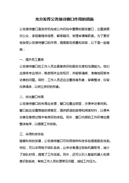 充分发挥公务接待窗口作用的措施公务接待窗口是政府机构或公共机构中重要的服务窗口,它直接面对公众,承担着提供信息、解答疑问、受理申请等职责。