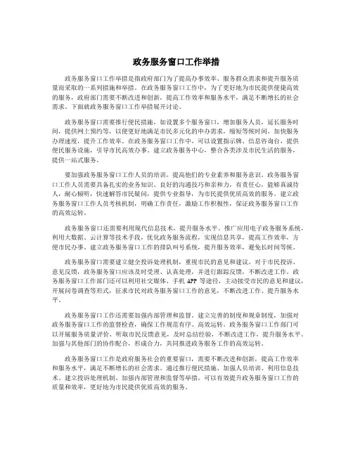 二、具体措施(一)优化服务环境1、保持大厅整洁卫生,定期安排专人进行清洁和消毒,为群众提供舒适的办事环境。
