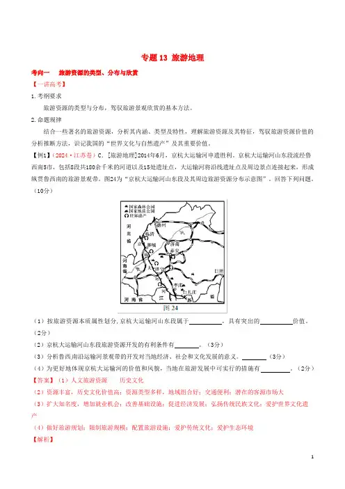 专题13 旅游地理考向一旅游资源的类型、分布与欣赏【一讲高考】1.考纲要求旅游资源的类型与分布,驾驭旅游景观欣赏的基本方法。