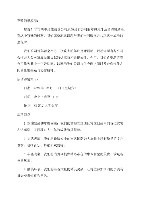 年终尾牙邀请函尊敬的各协力厂商:辞旧迎新,转眼又迎来崭新的____年,在过往的一年里,感谢贵公司长期以来的大力支持及配合,在新的一年里,期盼我们的合作更上一层楼!!新年伊始,为了答谢公司全体员工的辛勤付出,公司定于____年元月____日尾牙宴会,诚邀贵公司参与,您的支持将给晚宴添姿添彩,在此我谨代表公司全体员工向你们表示衷心感谢!提供以下几项赞助方式供您选择:□现金□货款扣除参加人数参加人数 (请于元月____日前回传,便于我司安排。