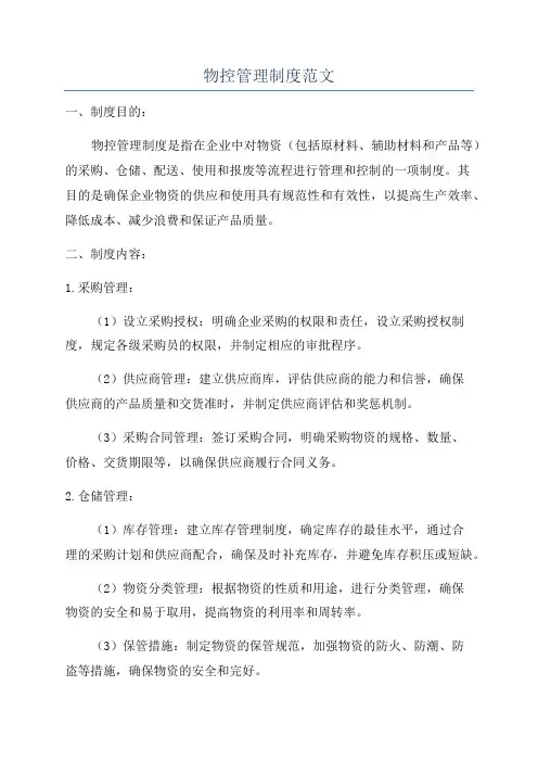 物控管理制度范本第一章总则第一条为了规范公司物资控制(以下简称物控)管理,提高物资使用效率,降低成本,确保公司正常生产经营,制定本制度。