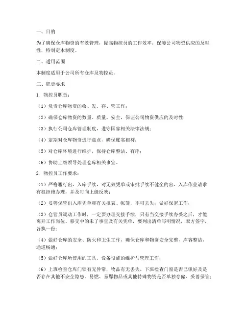 一、目的为了确保仓库物资的有效管理,提高物控员的工作效率,保障公司物资供应的及时性,特制定本制度。