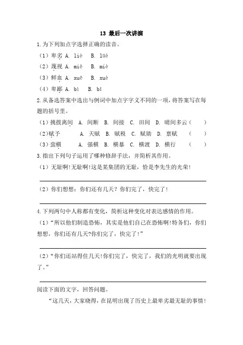 人教部编版2019-2020年八年级下册语文练习13 最后一次讲演(含答案)