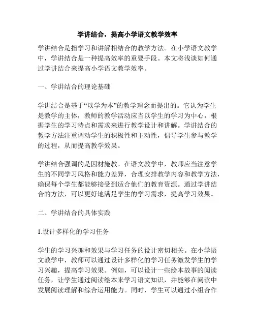 学讲结合,提高小学语文教学效率一、引言语文作为学生学习的基本功课之一,在小学阶段尤为重要。