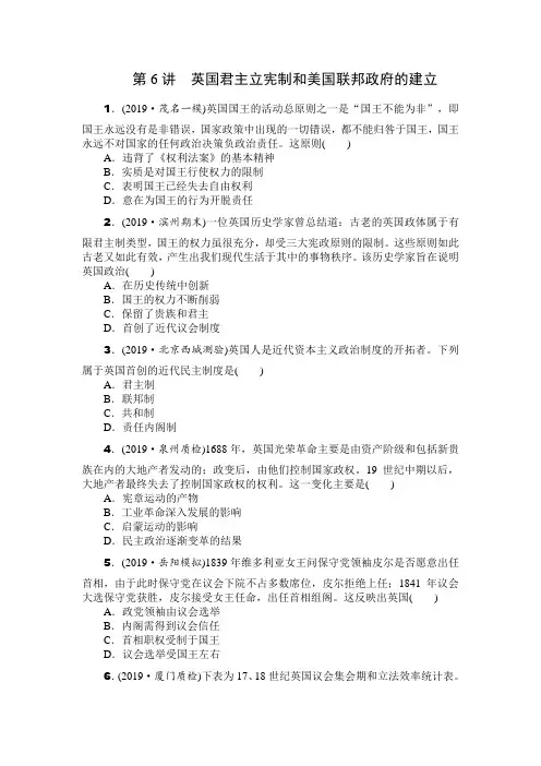 第6讲英国君主立宪制和美国联邦政府的建立1.(2019·茂名一模)英国国王的活动总原则之一是“国王不能为非”,即国王永远没有是非错误,国家政策中出现的一切错误,都不能归咎于国王,国王永远不对国家的任何政治决策负政治责任。