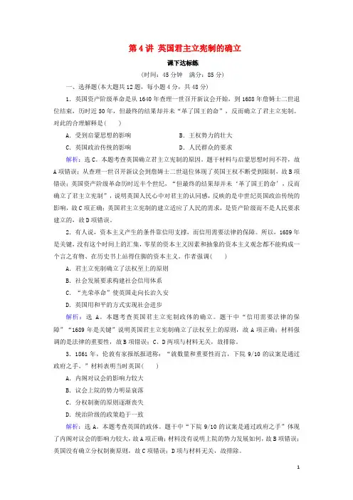 第4讲英国君主立宪制的确立课下达标练(时间:45分钟满分:85分)一、选择题(本大题共12题,每小题4分,共48分)1.英国资产阶级革命是从1640年查理一世召开新议会开始,到1688年詹姆士二世退位结束,历时近50年,但最终的结果却并未“革了国王的命”,反而确立了君主立宪制。