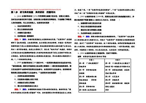 3.[2013·全国新课标卷Ⅰ]1688年,英国议会迎立荷兰执政威廉为国王,并拥立他的妻子玛丽(詹姆士二世的女儿)为女王,目的是()A.加强英国与荷兰的友好关系B.否定王位世袭男性优先原则C.通过双王相互牵制防止独裁D.为光荣革命披上合法的外衣答案:D解析:解答本题的关键是准确理解材料。