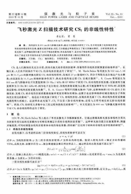 浅谈Z—scan法在研究非线性光学材料中的应用和经验作者:彭蕊来源:《中国科技纵横》2013年第24期【摘要】利用波长为532nm的纳秒激光脉冲,通过Z-scan技术研究了Fe3O4纳米粒子在不同光强下的非线性吸收特性,随着光强的增加,开孔Z-scan由饱和吸收为主转为反饱和吸收为主,在高光强下,表现出了优良的光限幅性质。