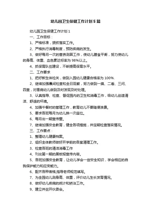 幼儿园卫生保健工作计划5篇幼儿园卫生保健工作计划1一、工作目标:1、严格标准,狠抓落实工作。