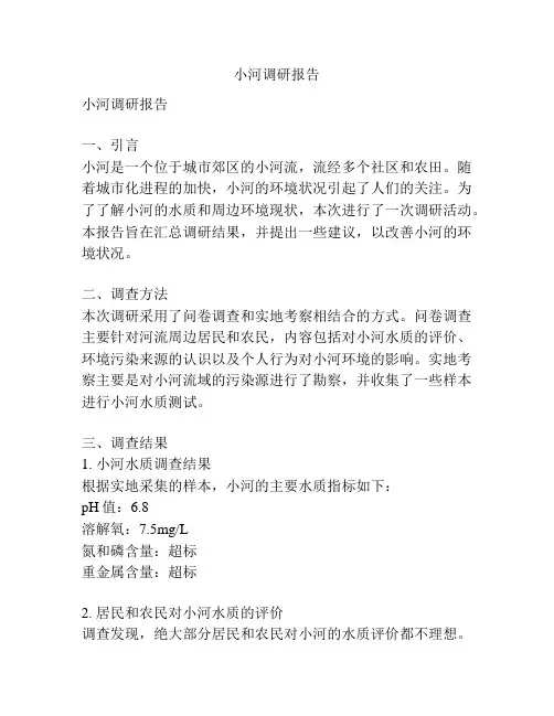 小河调研报告小河调研报告一、引言小河是一个位于城市郊区的小河流,流经多个社区和农田。