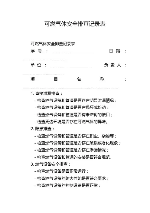 可燃气体安全排查记录表可燃气体安全排查记录表序号:_______________________ 日期:_______________________单位:_______________________ 负责人:_______________________项目名称:_____________________________________________________1. 直接泄漏排查:- 检查燃气设备和管道是否存在明显泄漏情况;- 检查燃气设备和管道是否有损坏或松动;- 检查燃气设备和管道是否有未密封的接口;- 检查周边环境是否存在可燃气体的异味。