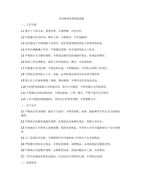 车间规章管理制度看板一、工作守则1.1 遵守上下级关系,尊重同事,互相理解,共同合作。