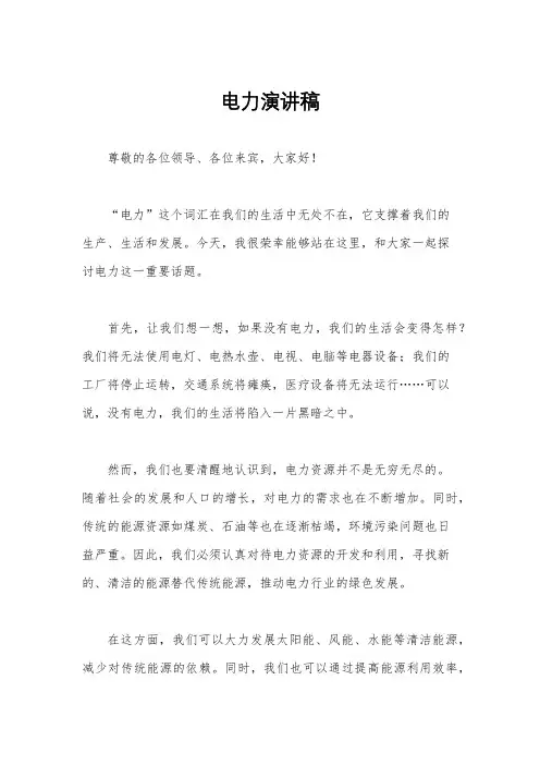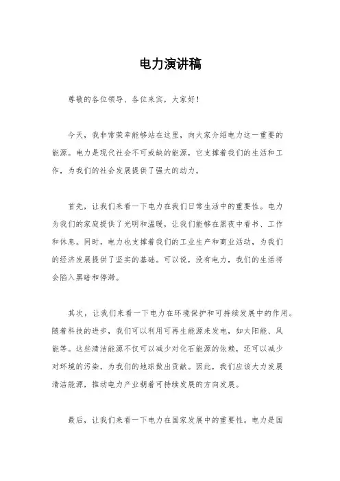 尊敬的各位领导、各位来宾,大家好!今天,我非常荣幸能在这里向大家分享有关电力的一些观点和想法。