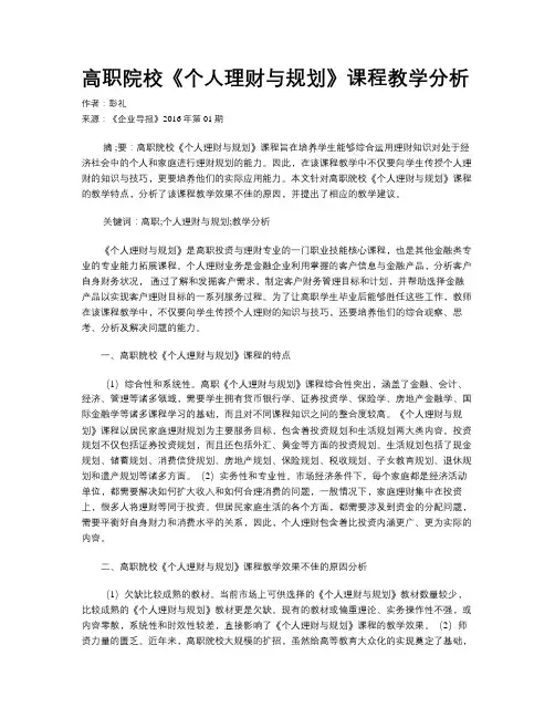 高职院校《个人理财与规划》课程教学分析-2019年教育文档一、前言个人理财与规划是现代社会所必需的知识,每个人都需要从小学习并掌握这些知识,以便在以后的生活中更好地管理和使用自己的财富。